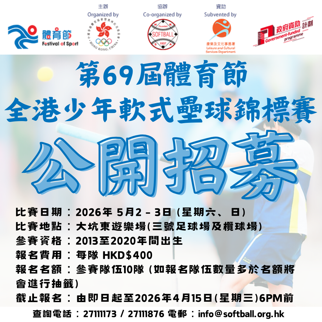 2K 第69屆體育節 – 全港少年軟式壘球錦標賽-章程 第69屆體育節 – 全港少年軟式壘球錦標賽-參賽確認報名表格 第69屆體育節 – 全港少年軟式壘球錦標賽-家長同意書 第69屆體育節 – 全港少年軟式壘球錦標賽-球隊及球員註冊報名表